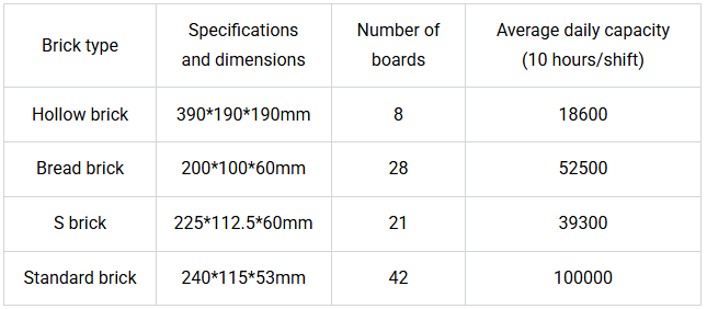 | Brick type | Specifications and dimensions | Number of boards | Average daily capacity (10 hours/shift) |